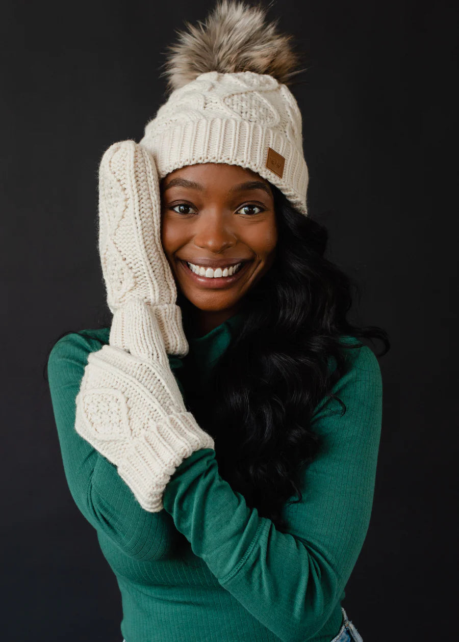 Crafted with a classic cable knit construction, this hat features a luxurious natural faux fur pom accent that adds a touch of sophistication to any cold-weather ensemble.