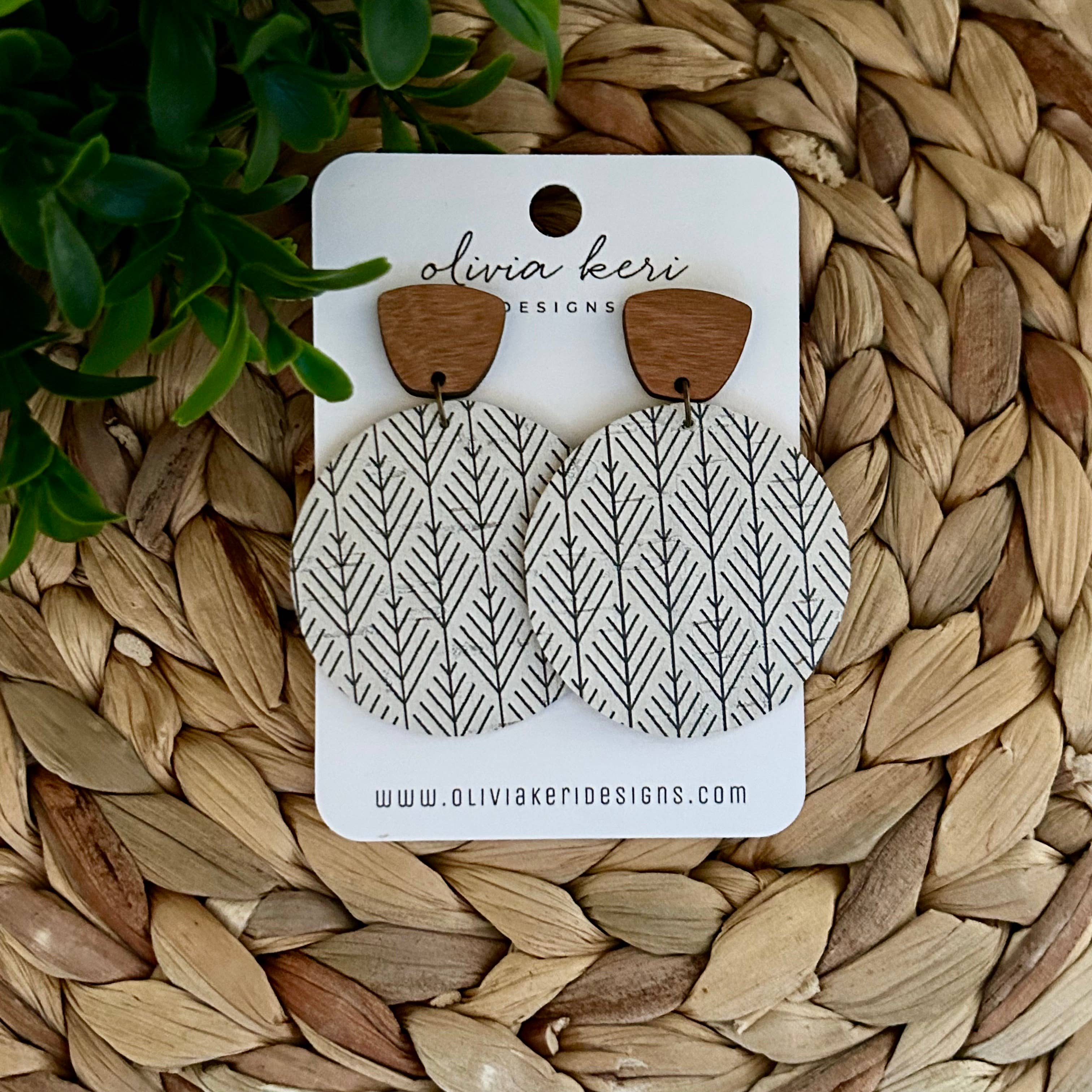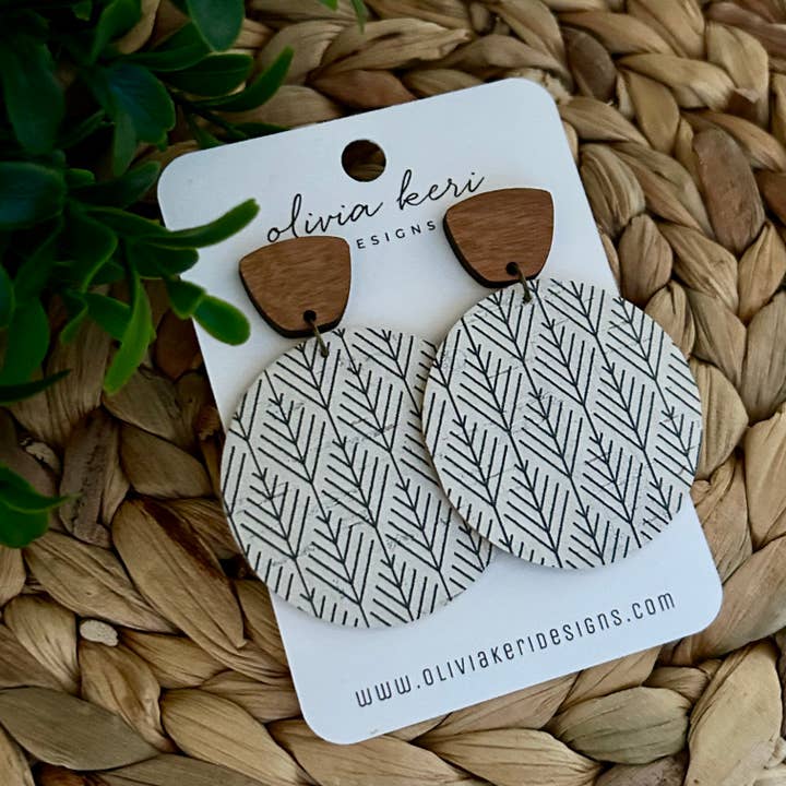Beautiful round earrings made with genuine cork on leather featuring a wood accent. Lightweight and gorgeous!