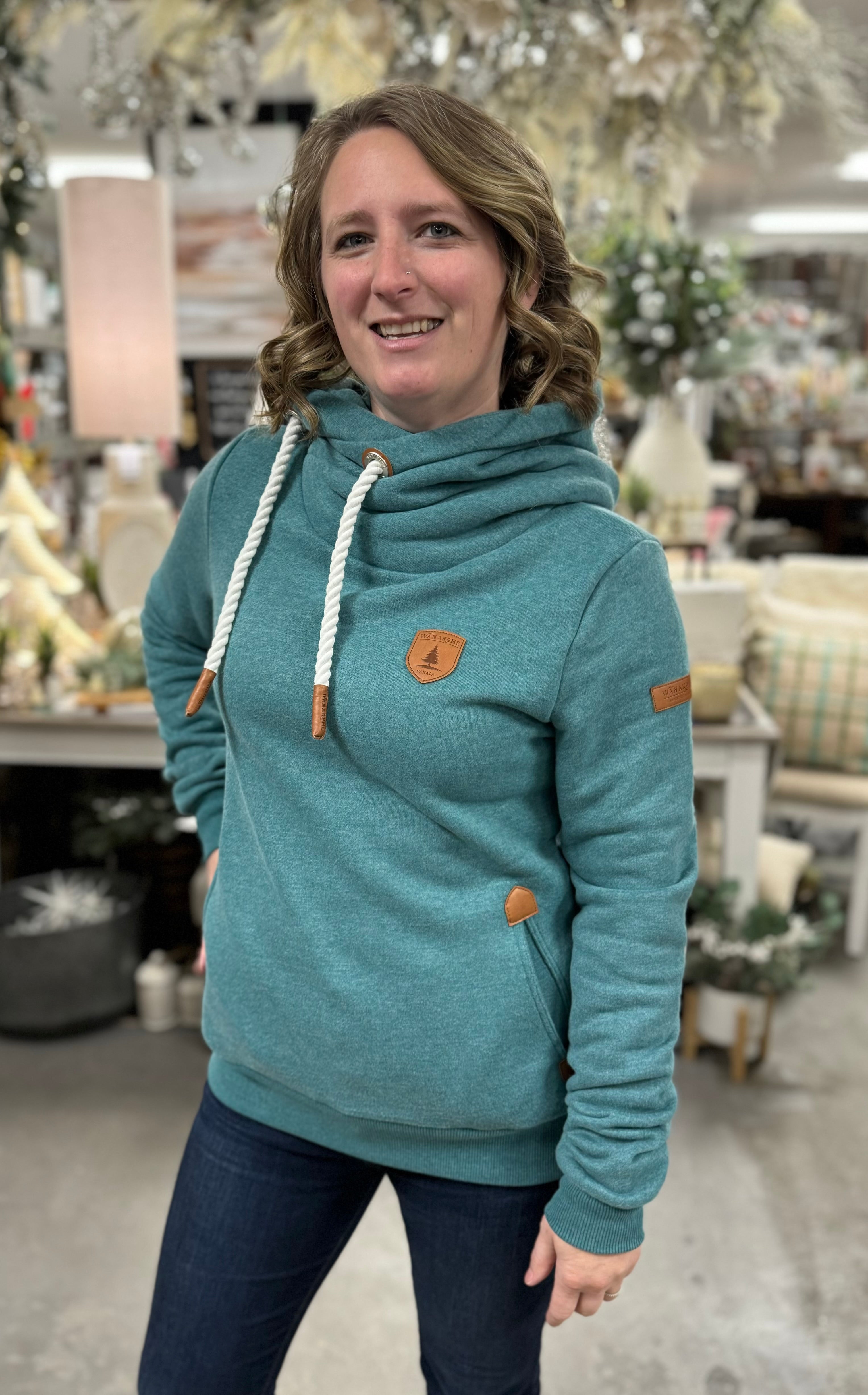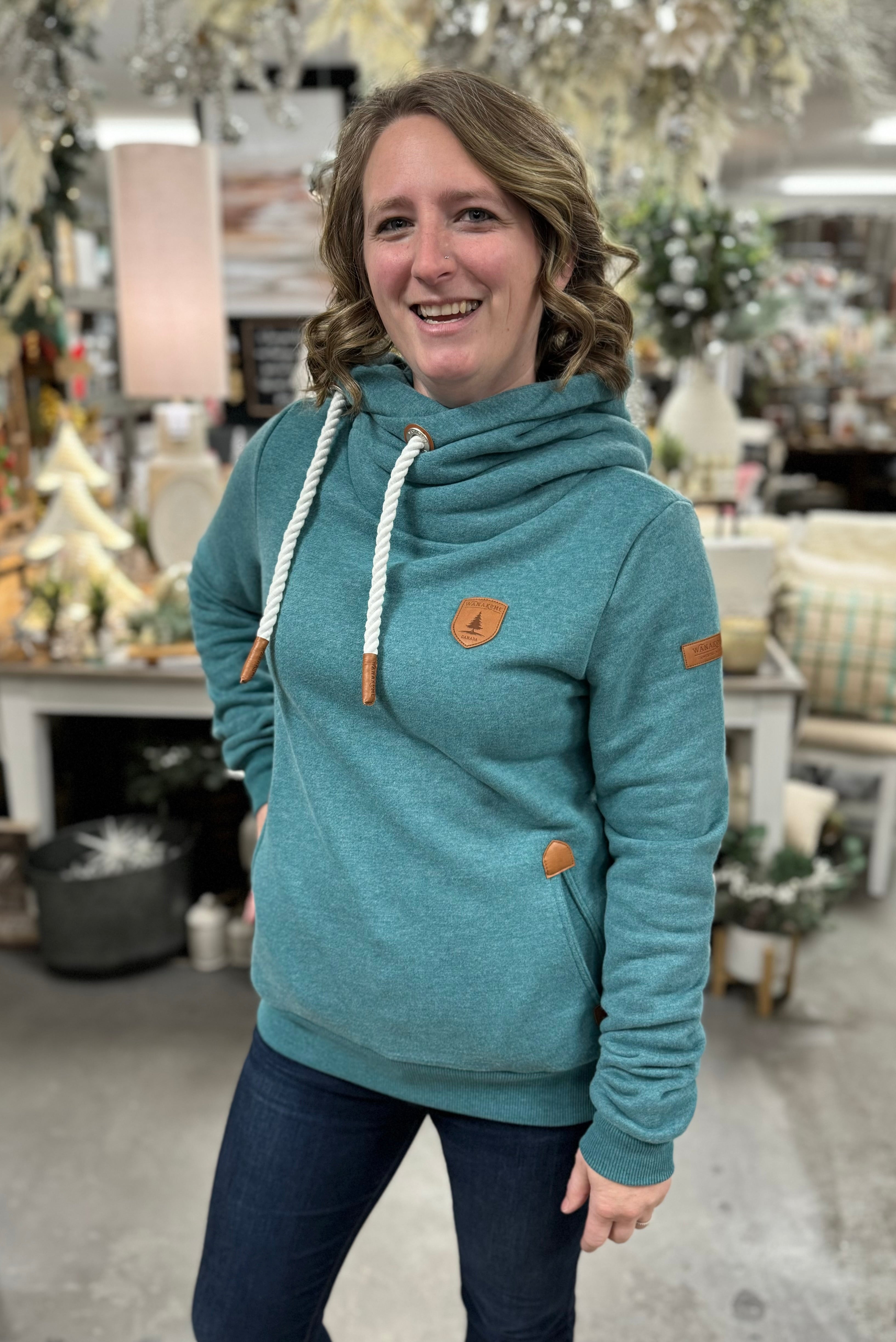 We love our Hoodies from Wanakome - which is why all of us own more than one! This pull-over has the high collar with a hood to keep you warm & stylish in the malard Teal color. Leather detail on strings and Wanakome logos.