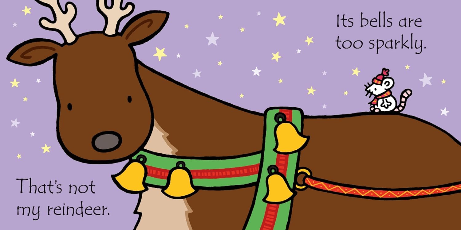 A furry body, a hairy tail and a shiny nose are some of the tactile patches on the reindeer that plod through the snowy scenes in this sturdy board book. There's lots to share and talk about, as well as the familiar little white mouse to spot on every page.