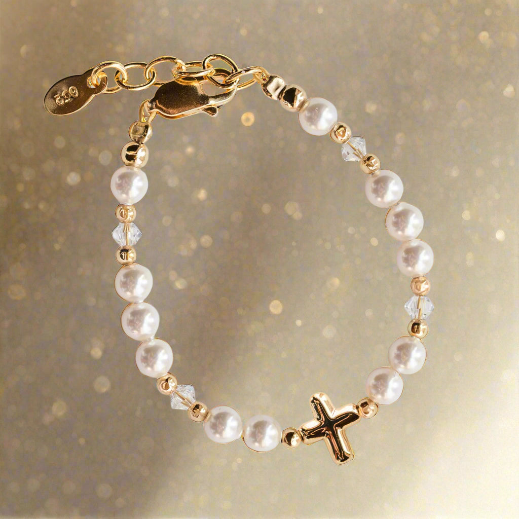 Experience the beauty and quality of Eve 14K Gold-Plated Baby Cross Bracelet. Hand-crafted in the USA with luxurious Austrian simulated pearls and high-end 14K Gold-plated beads, this bracelet features a dainty cross at its center, adorned with sparkling crystals.
