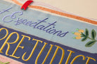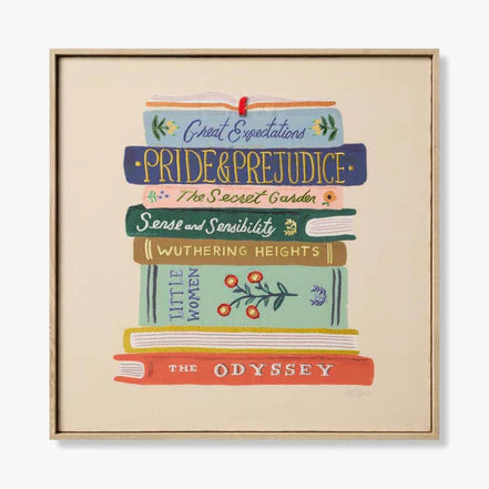 A book lover's must-have with embroidered stacked books of the classics, designed by Rifle Paper. This Book Club Framed Wall Hanging by Rifle Paper x Loloi is encased professionally in a frame with glass. Great for your library, office, bedroom or reading nook.