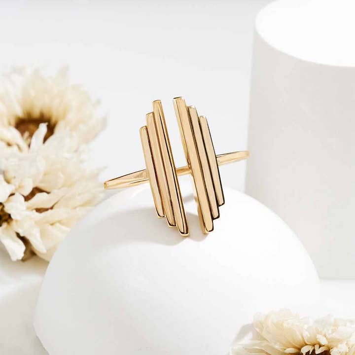 Elevate your jewelry game with this stunning stepped bar adjustable ring. The sleek, modern design features two symmetrical sets of solid silver bars, creating a hypnotizing illusion of floating bars on your fingers.