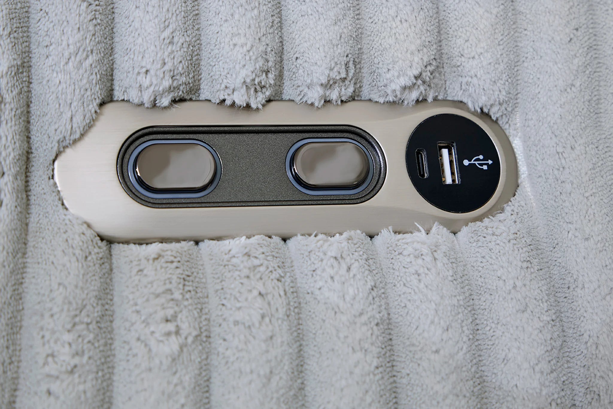 Power buttons with built in USB charger are neatly hidden behind the right hand cushion.