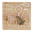 The trivet features engraved conversions and measurement guides for all your holiday baking needs and comes with a metal Christmas tree cookie cutter.