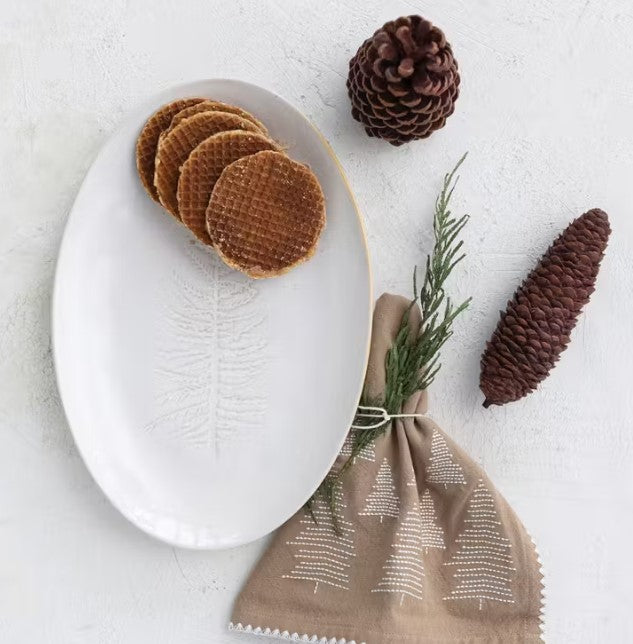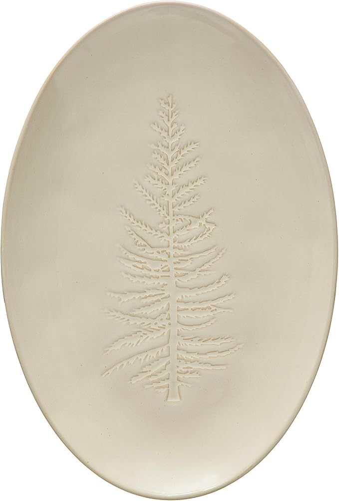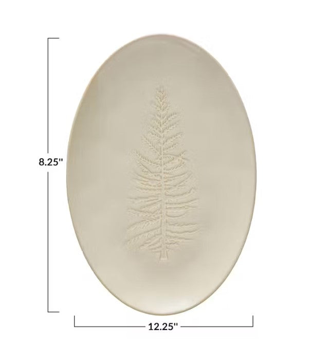 Oval Stoneware Platter w/ Tree Design, White | Holiday & Christmas Entertaining Serving Tray