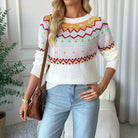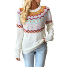 Color Block Knit Sweater Round Neck Top, White | Christmas Patterned Sweater