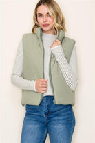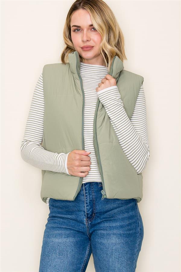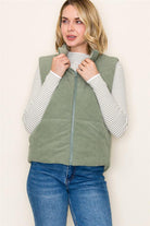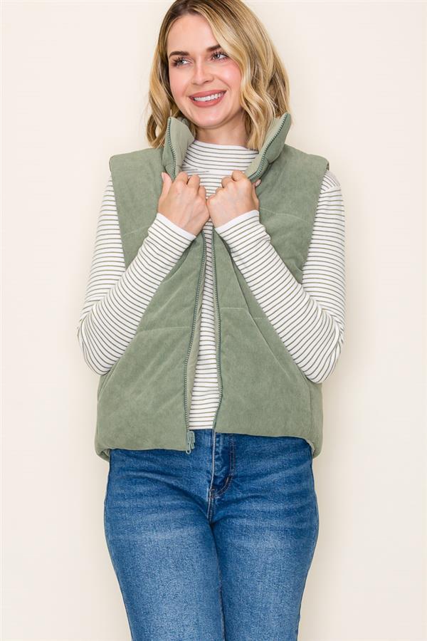 Stay warm and stylish with the Corduroy Reversible Puffer Vest in Sage by Staccato.