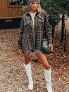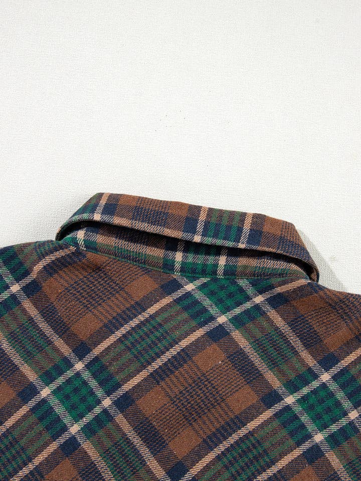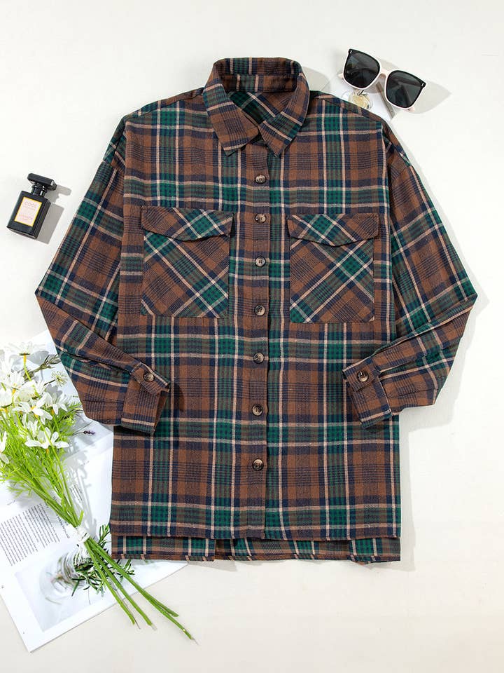 Discover the perfect blend of style and practicality with this Plaid Buttoned Shacket in a rich brown tone.