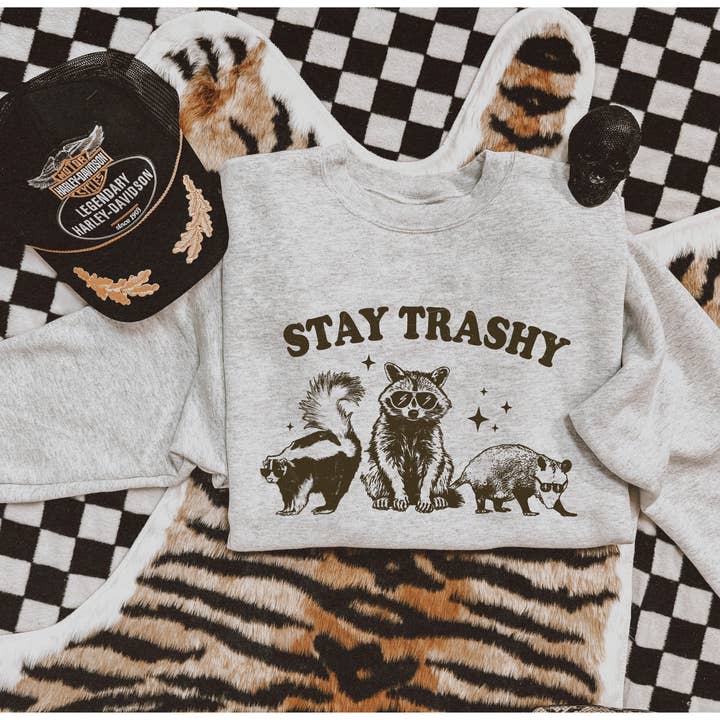 Add a playful touch to your wardrobe with the Stay Trashy graphic crew sweatshirt featuring a skunk, raccoon, and opossum.