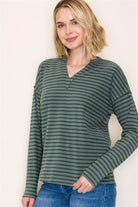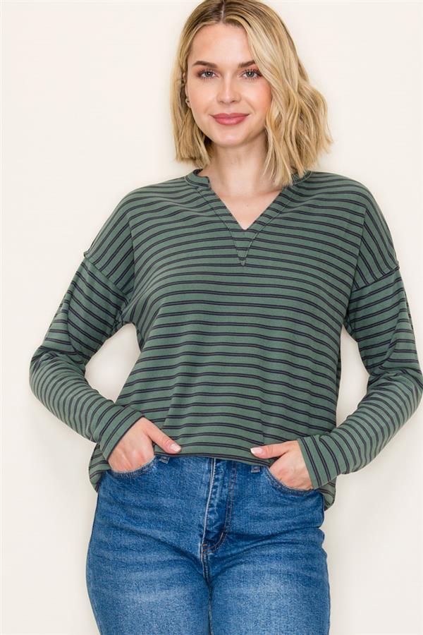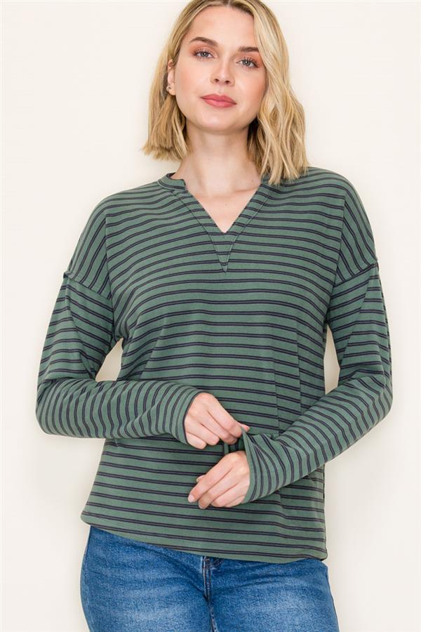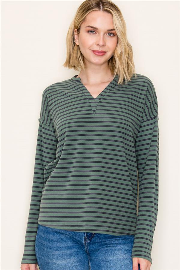 V-Neck Long Sleeve w/ Stripes Super Soft, Sage | Staccato