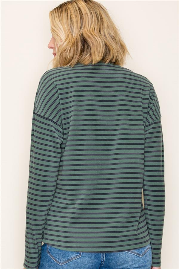 Embrace cozy vibes with this super soft V-neck long sleeve in a fresh sage hue, accented by playful stripes.