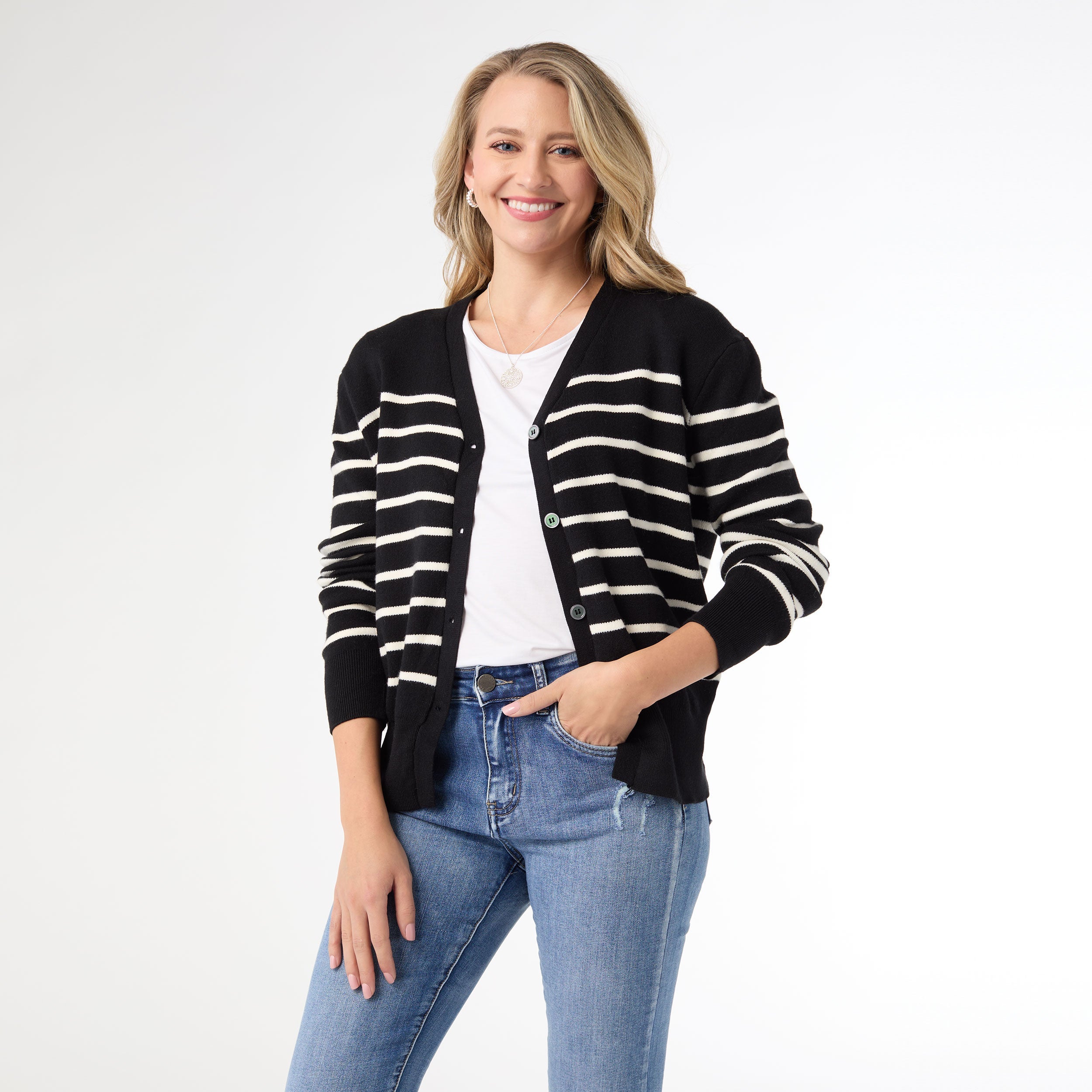 This cozy, long-sleeve cardigan offers a chic striped pattern and a convenient button-front design, making it effortless to layer over your favorite basics.