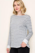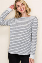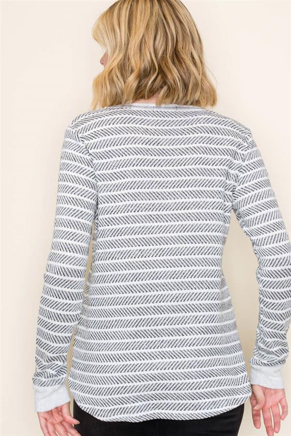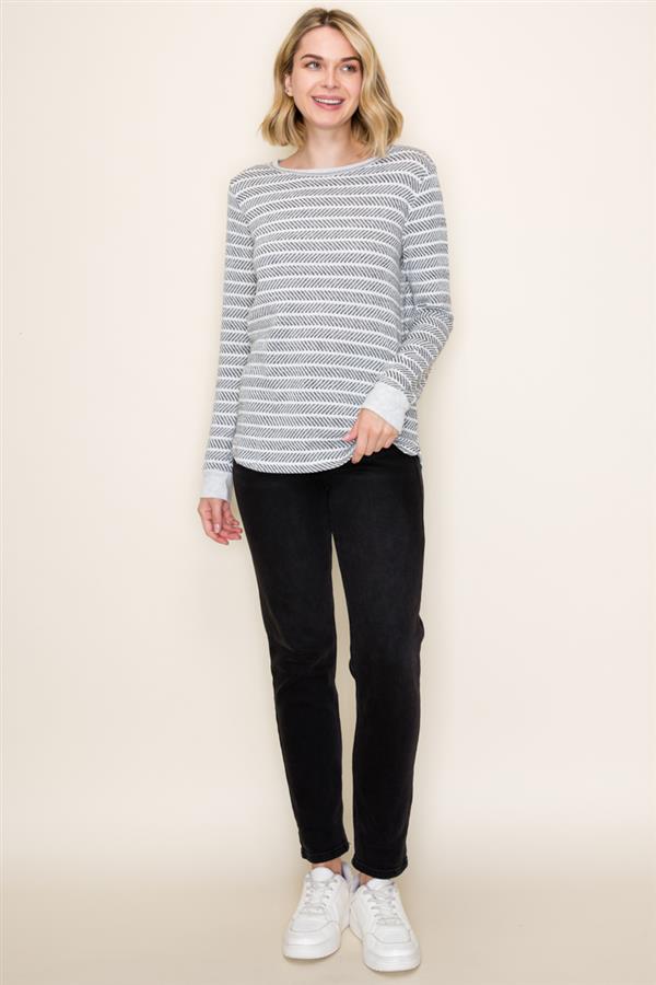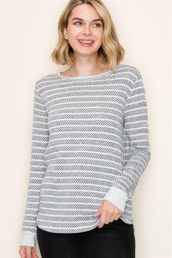 Wide Crew Neck Long Sleeve Texture Striped Top, Charcoal | Staccato
