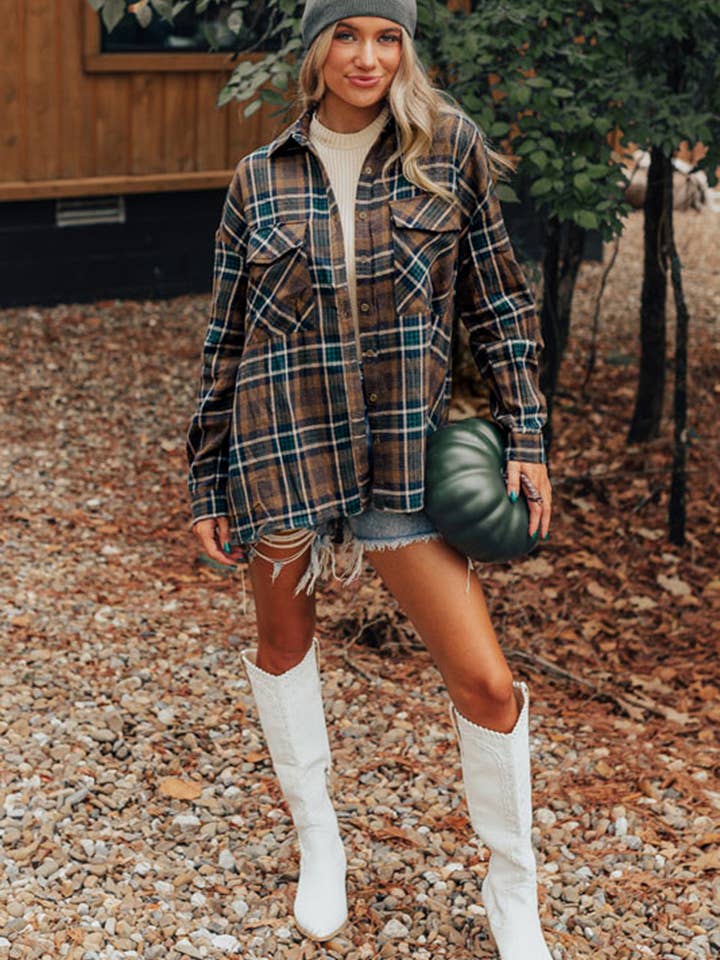 Plaid Buttoned Shacket with Chest Pockets, Brown