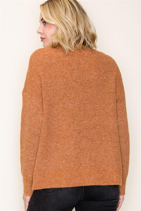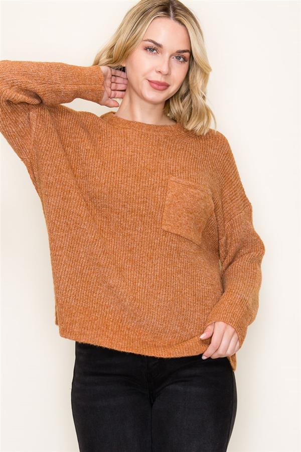 Crew Neck Long Sleeve Oversized Sweater w/ Chest Pocket, Camel | Staccato