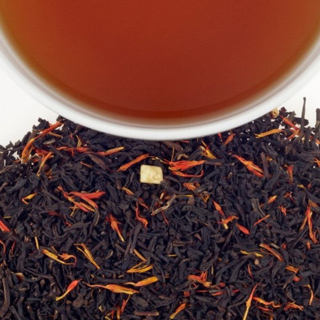Ingredients: Black tea, cloves, almond flavor, orange flavor, vanilla flavor, safflowers, three types of cinnamon, orange pieces. Contains natural flavors.