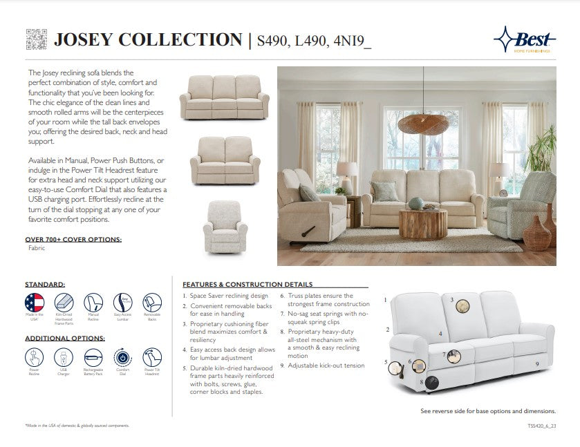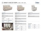 The Josey reclining sofa blends the perfect combination of style, comfort and functionality that you’ve been looking for. The chic elegance of the clean lines and smooth rolled arms will be the centerpieces of your room while the tall back utilizes generous amounts of pillow fibers that envelopes you; offering the desired back, neck and head support.