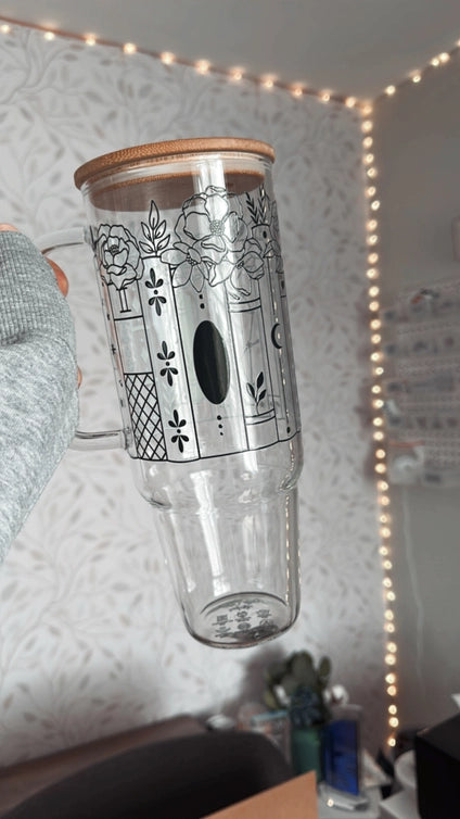 Key Features: 40oz capacity, clear glass. Permanent vinyl design. Includes bamboo lid, handle, and reusable straw Optional laser-engraved lid to match the design.