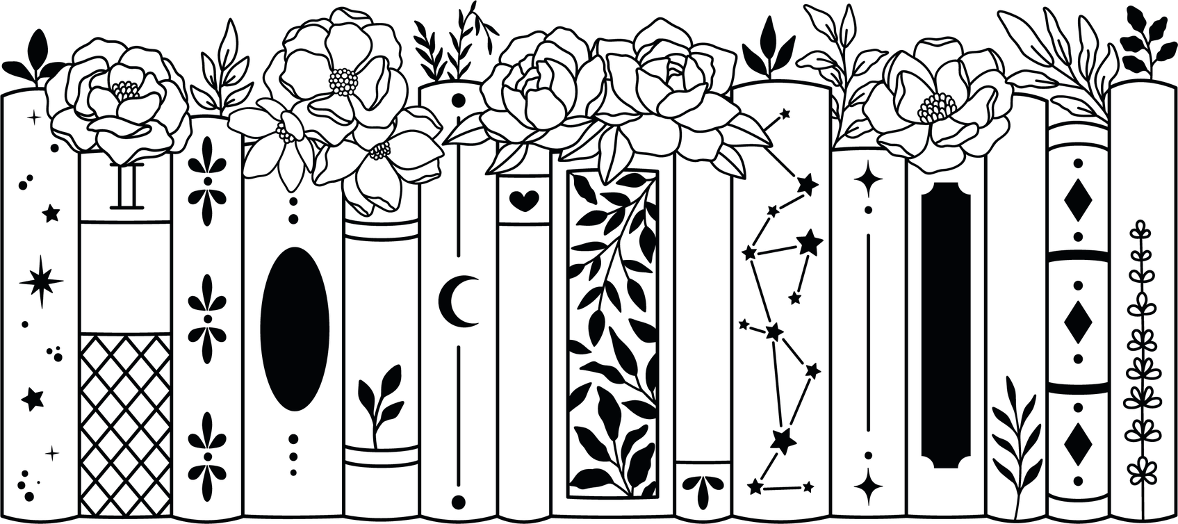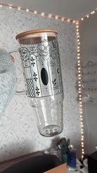 40oz Glass Tumbler with Handle & Vinyl Design. Black line design with books, floral cutouts, and celestial designs.