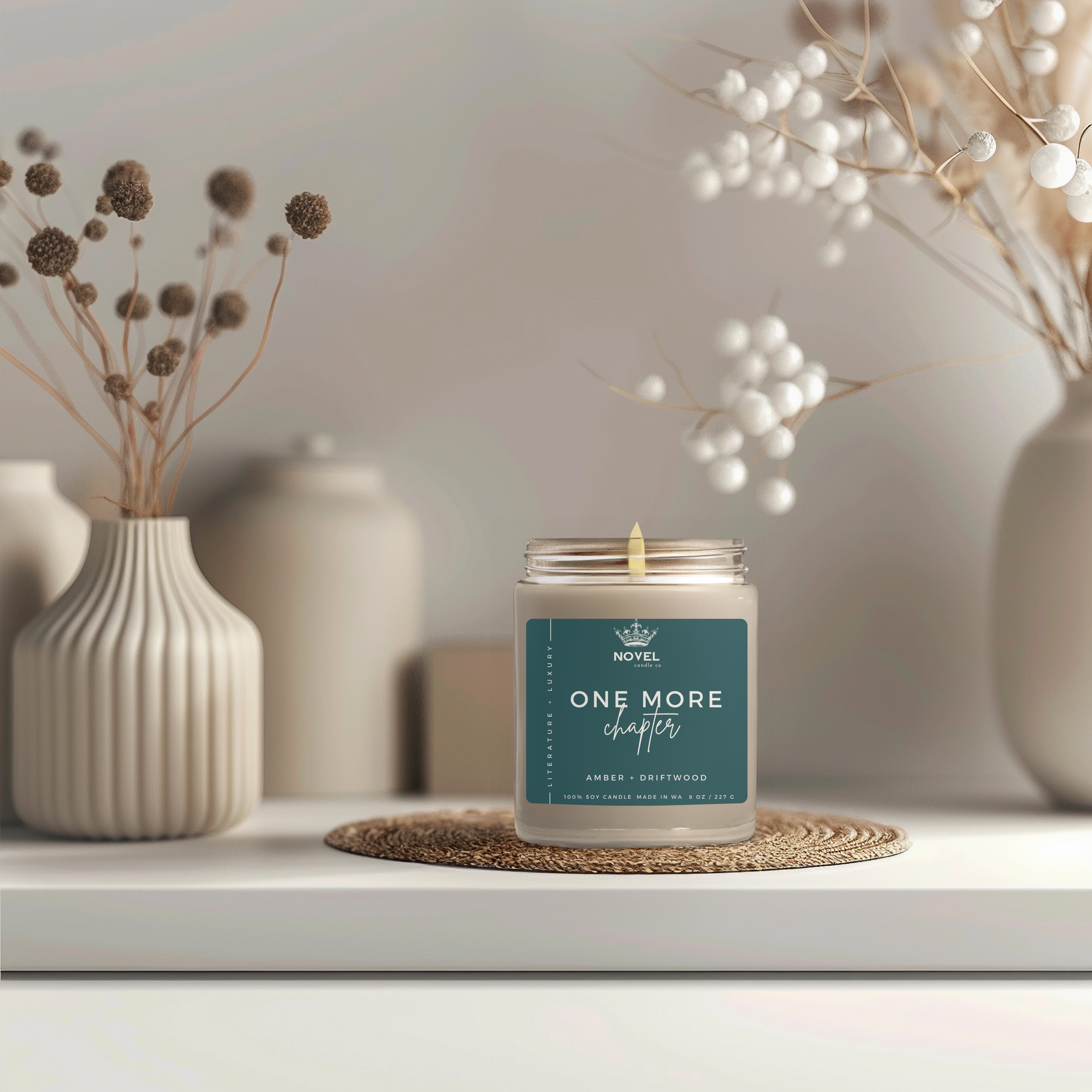 One More Chapter : Book Lover's Candle. Amber + Driftwood top notes: ozone, citrus middle notes: sandalwood, benzoin bottom notes: dark musk, amber, cedar, powder. Burn while reading for a delightful experience.