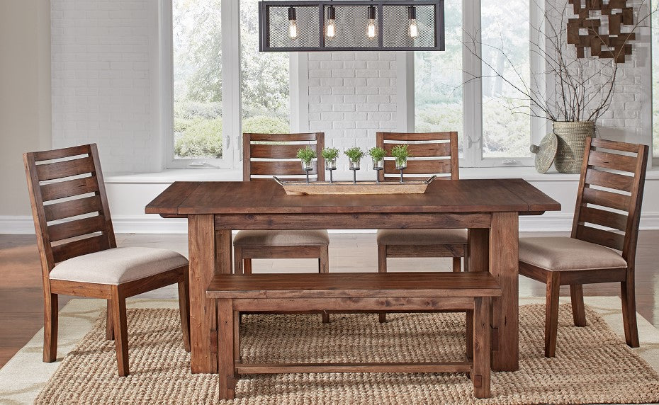 Th Anacortes dining set is one of our favorites. The multi-tone finish features a lighter ginger-colored patina that resembles reclaimed wood, originally in demand for loft living spaces and then crossing over into the fashion-focused mainstream. It's modern & rustic in one. The finish is wire-brushed with a soft hand to enhance the look and impart an aged character quality.