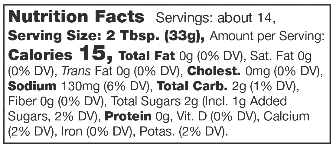 Tomatoes (tomato juice, citric acid, calcium chloride), White Vinegar, Jalapeno Peppers, Onions, Pure Cane Sugar, Garlic, Lime Juice Concentrate, Cilantro, Salt, Crushed Red Pepper Flakes.