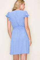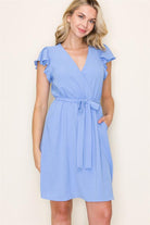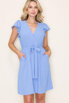 V-Neck Flutter Sleeve Cap Elastic Waist Dress w Pockets, Blue | Staccato