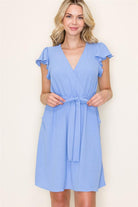This versatile dress features a flattering v neckline, feminine flutter sleeves, and a belted elastic waist for the perfect fit.