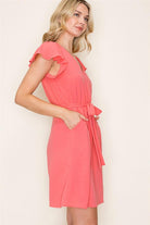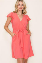 V-Neck Flutter Sleeve Cap Elastic Waist Dress w Pockets, Coral | Staccato