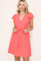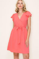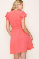 Add a pop of bold summer coral to your wardrobe with this V-Neck Flutter Sleeve Cap Elastic Waist Dress!