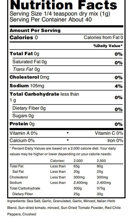 Ingredients: Unrefined sea salt, oregano, basil, thyme, rosemary, marjoram, sun-dried tomato, garlic, crushed red pepper