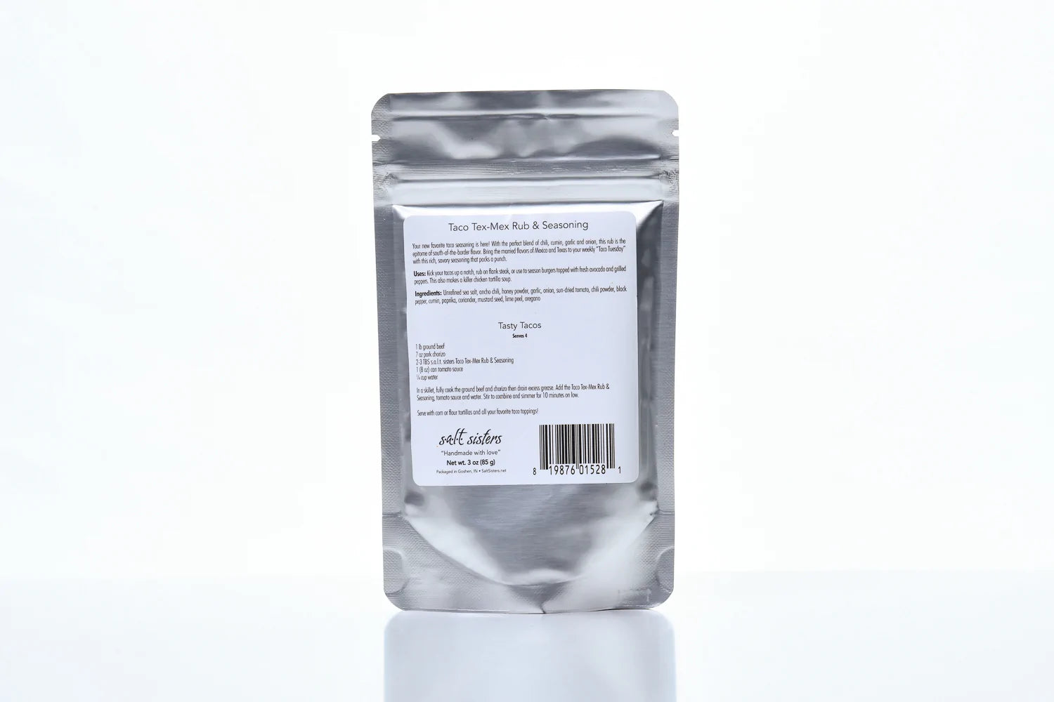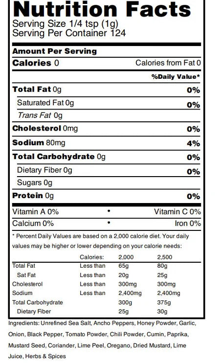 Ingredients: Unrefined sea salt, ancho chili, honey powder, garlic, onion, sun-dried tomato, chili powder, black pepper, cumin, paprika, coriander, mustard seed, lime peel, oregano
