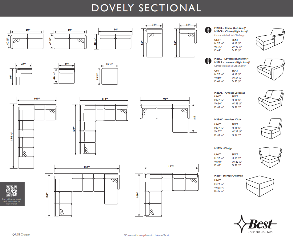 Pick from seven different pieces to customize your sectional, which provide countless configurations to fit your home. Two pillows come standard with armed units, as well as the optional storage ottoman - which can be placed on either end to create an infinity seating effect.
