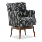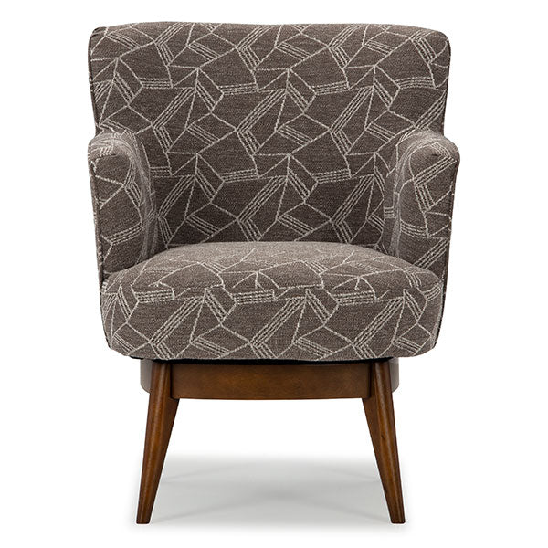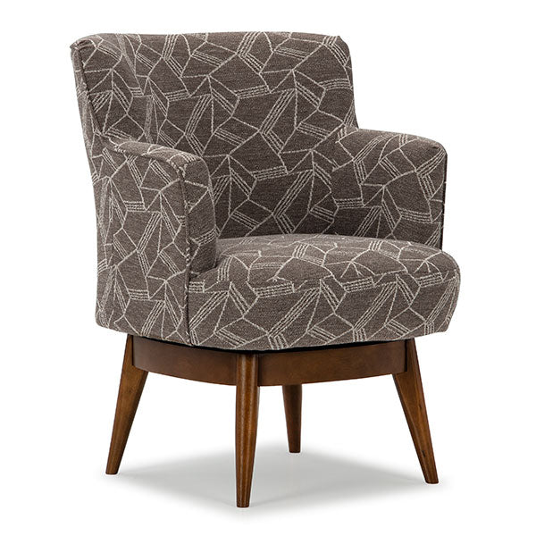 The swivel base sits atop tall legs in Dark Walnut, Espresso and Riverloom finishes with over 700 fabrics available. Built in the USA with fine craftsmanship.