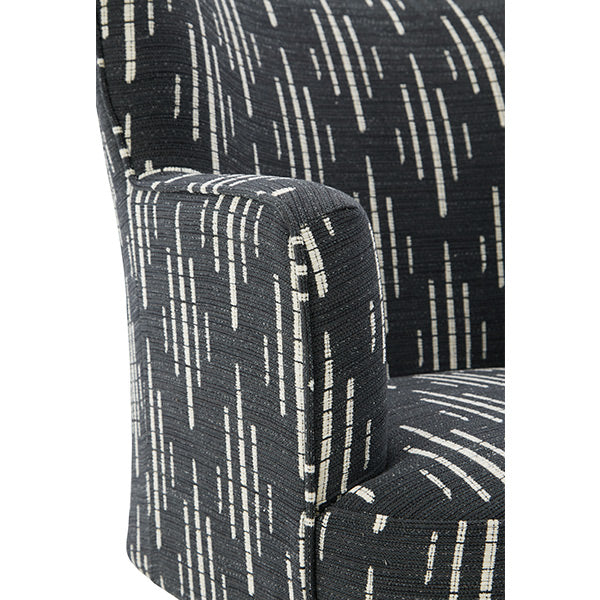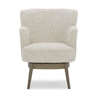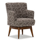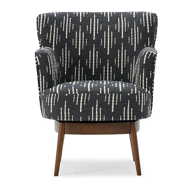The Kelida swivel chair is a mid-century modern, 360-degree swivel barrel chair. It offers a slightly rounded back and tall arms that are accented with cording.