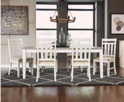 Sitting pretty with the Summerville seven-piece rectangular table set. Crafted of rubberwood solids with pine veneers, this set features soft whitewash bases with a wire brushed gray top and consists of the leg table and six splat back side chairs.