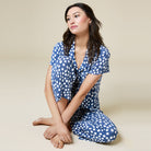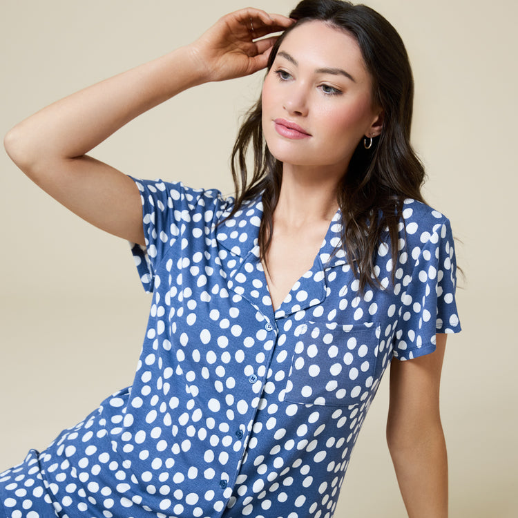 Say hello to your new favorite pajamas: the Aria-Slim Notch Collar Capri PJ Set from Softies featuring charming blue dots.