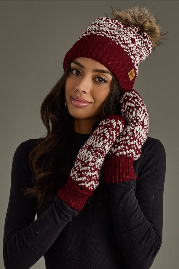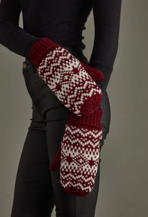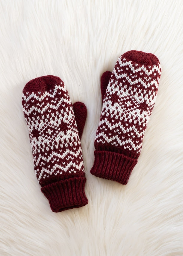 Stay warm and stylish with these burgundy and white patterned knit mittens.