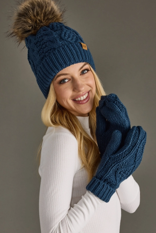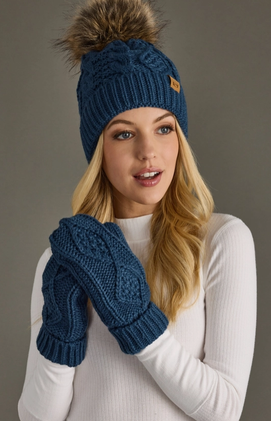 Crafted from premium cable knit fabric, these steel blue mittens deliver sophisticated warmth with timeless appeal.