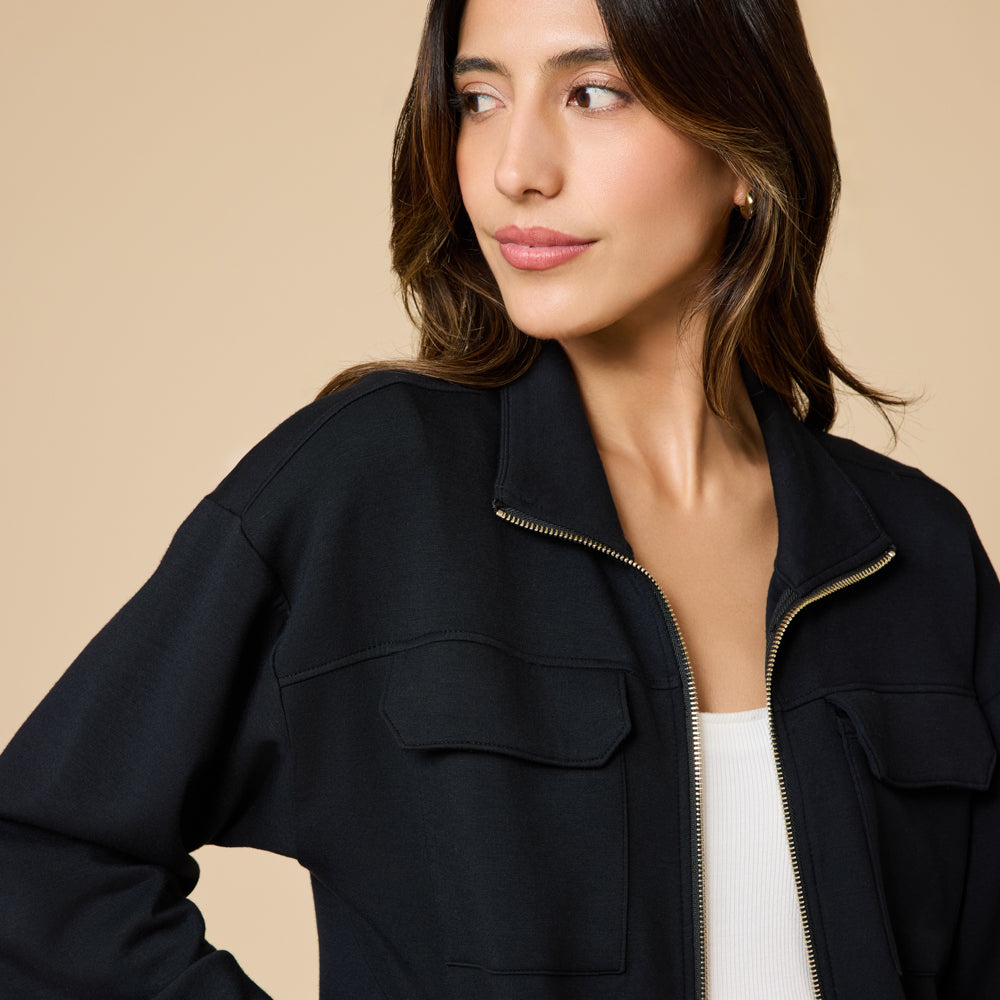 The DreamTech Double Zip Bomber Jacket blends sleek structure with cloud-soft comfort. Made from our signature DreamTech performance fabric—ultra-smooth, cool to the touch, and softly draped—this jacket offers an effortlessly polished look that’s built to move with you. Functional details like chest and side pockets, a double zipper, and ribbed trim add both utility and versatility. Whether you're heading to the airport, cooling down after a workout, or layering up for everyday wear, this modern bomber fits right in.
