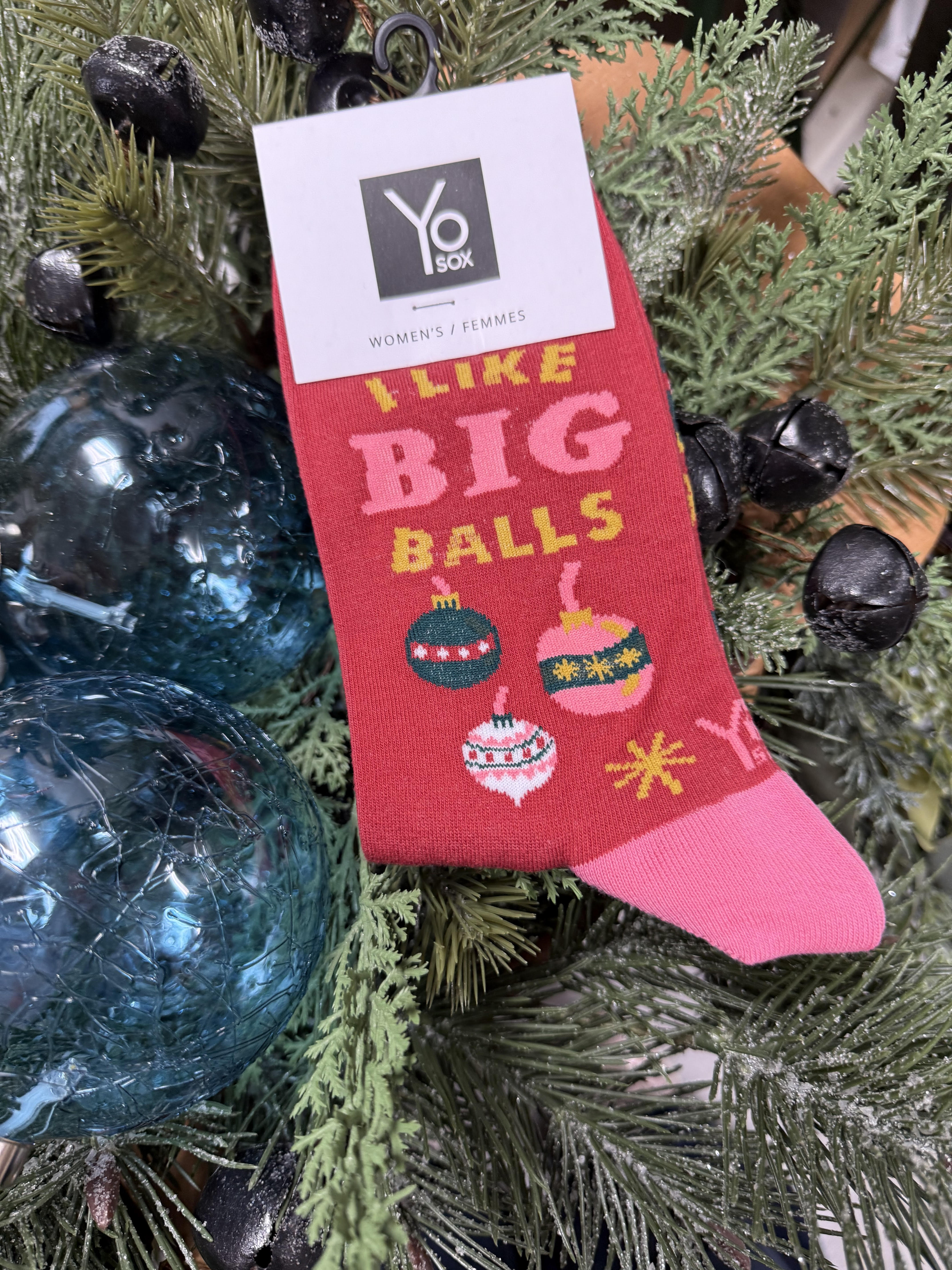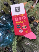 Women's holiday crew sock with Christmas ornaments and says "I Like Big Balls". YO Sox is made with tightly wound double spun cotton means your socks will stay the same size without stretching.