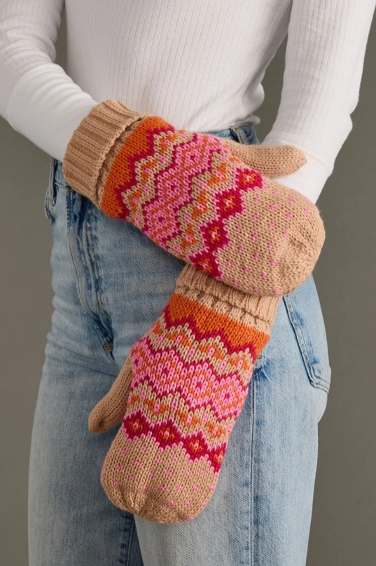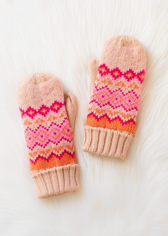Add a pop of color to your winter outfit with this Blush, Pink & Orange Patterned Mittens from Panache Apparel Co.