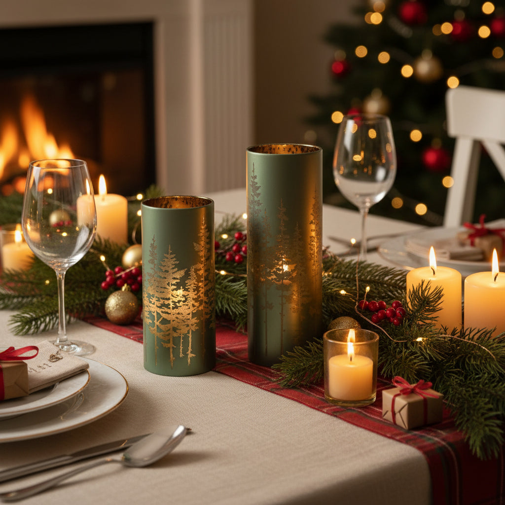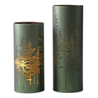 This elegant glass cylinder showcases an etched pine tree motif in a refined green tone.