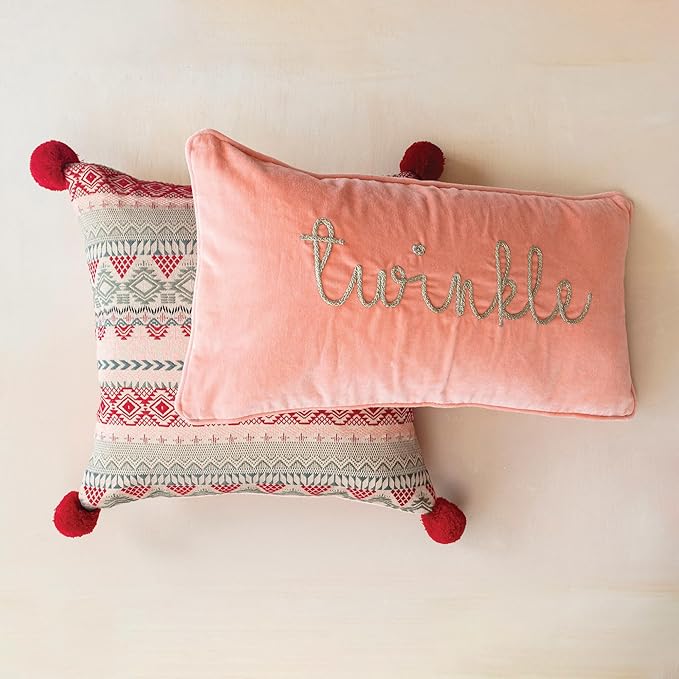 Pink, Red & Green Diamond Pattern Pillow w/ Pink Cotton Velvet Back Red Pom Poms | Home Decor