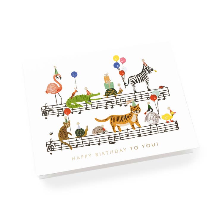 Send a heartfelt birthday message with a charming greeting card from Rifle Paper Co. Featuring an adorable design of wild animals atop musical notes and the Happy Birthday song in musical form, this card adds a playful touch to any celebration.