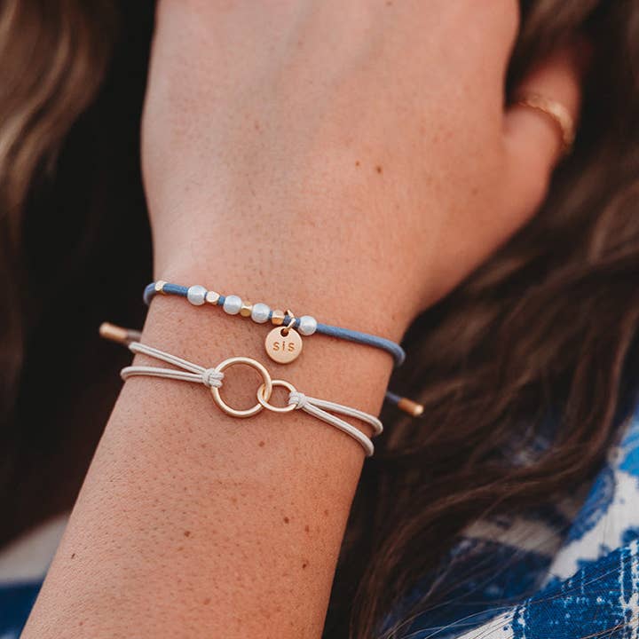 This beautiful set features dainty gold medal charms engraved with "Sis," along with delicate pearls, neutral colors, gold beads and interconnecting circles symbolizing the timeless bond you share.