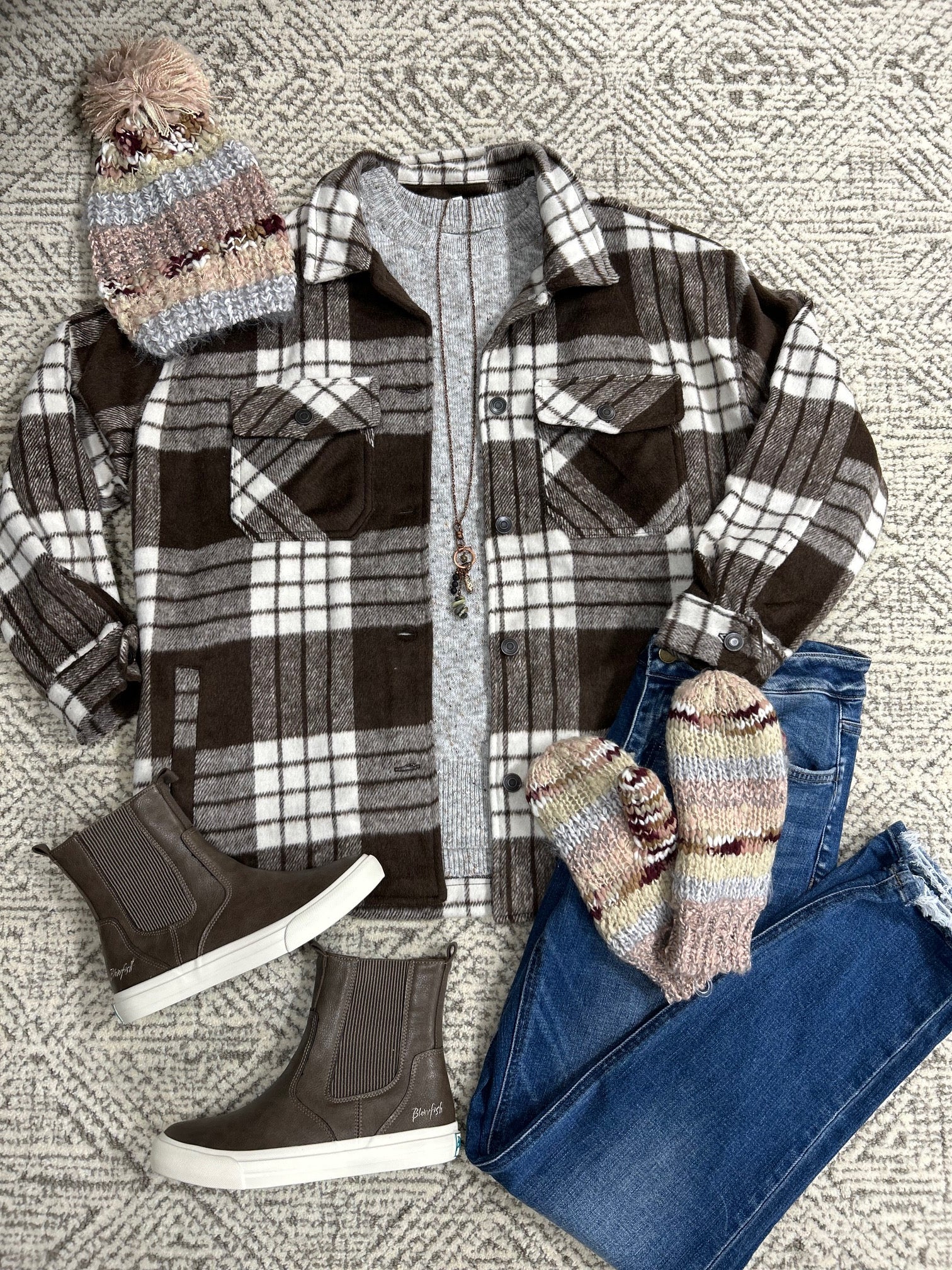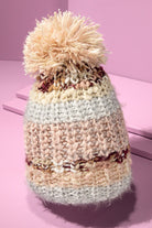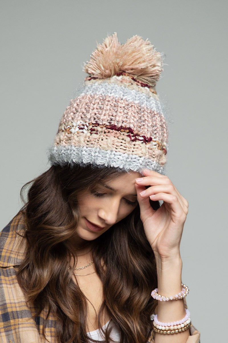 Add a touch of shimmer to your winter wardrobe with our Blush Shimmer Striped Knit Beanie.