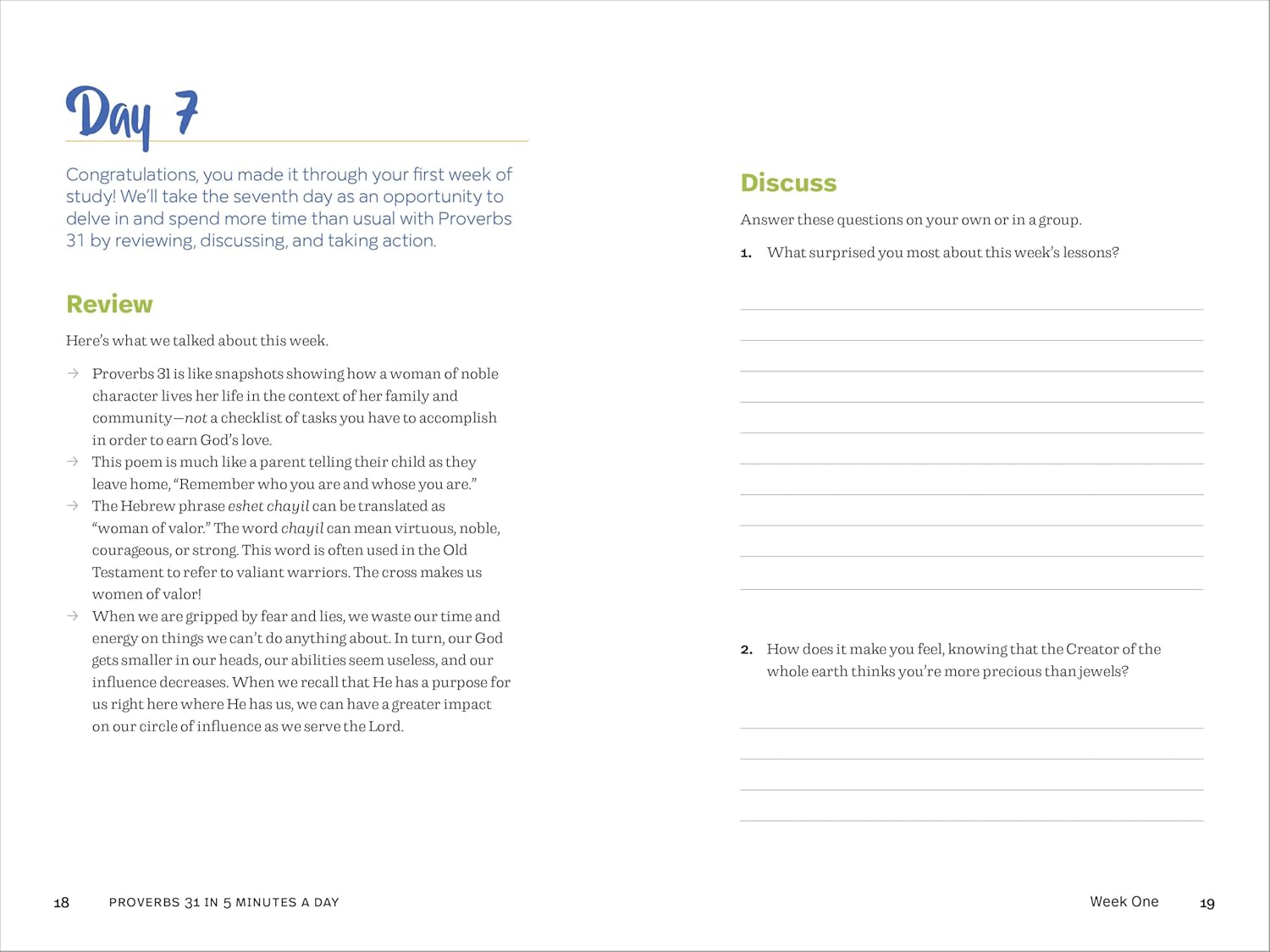 - Seven weeks to grow—Delve deeper into reflection and discussion on Day 7, and find concrete steps to act on what you’ve studied.