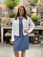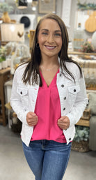 This lightweight cropped jacket is designed to be easily dressed up or down. Raw hem with distress details on sleeves gives this white jacket an updated trendy look.